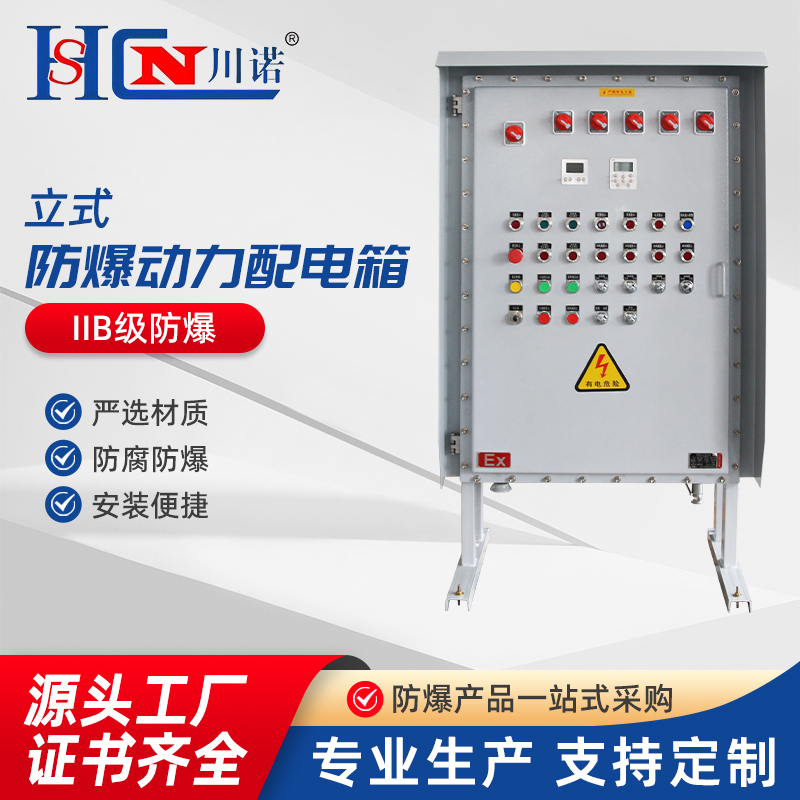 B、非标配电箱:外壳采用钢板焊接成型,表面喷塑。分主腔和接线腔,均采用隔爆型结构,内可选装高分断断路器、交流接触器、热继电器、控制按钮、信号灯等元件,通过操作壳盖上的手柄实现分合,动作性能可靠,并设有分合显示信号灯。进出线采用钢管或电缆布线均可,进出线口方向及内部元件可由用户要求而定。其它材料及外形均可根据用户要求订制。